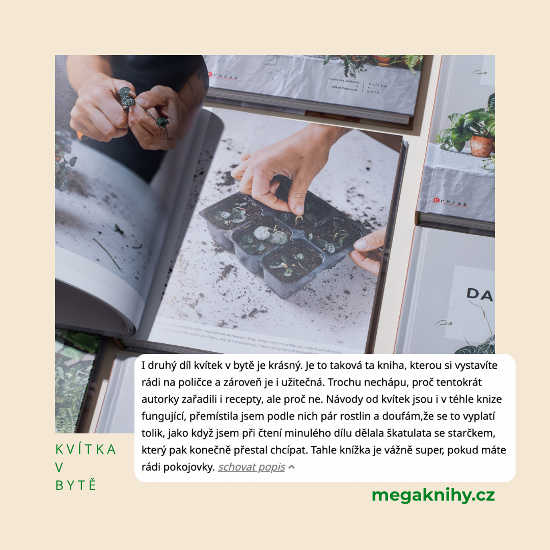 Kniha je rozdělena podle místností v bytě tak, abyste vždy věděli, jaké konkrétní rostliny zvolit na slunné, světlé a polostinné stanoviště té konkrétní místnosti. Abychom navázali na první knížku, blíže se věnujeme dalším druhům rostlin (alokáziím, stínovkám, begóniím) napříč místnostem celého bytu! S praktickými tipy se tentokrát rozrostete až na balkón a posunete svou zelenou vášeň zas o krůček dál. Vyzýváme vás ke kolonizaci balkónů!