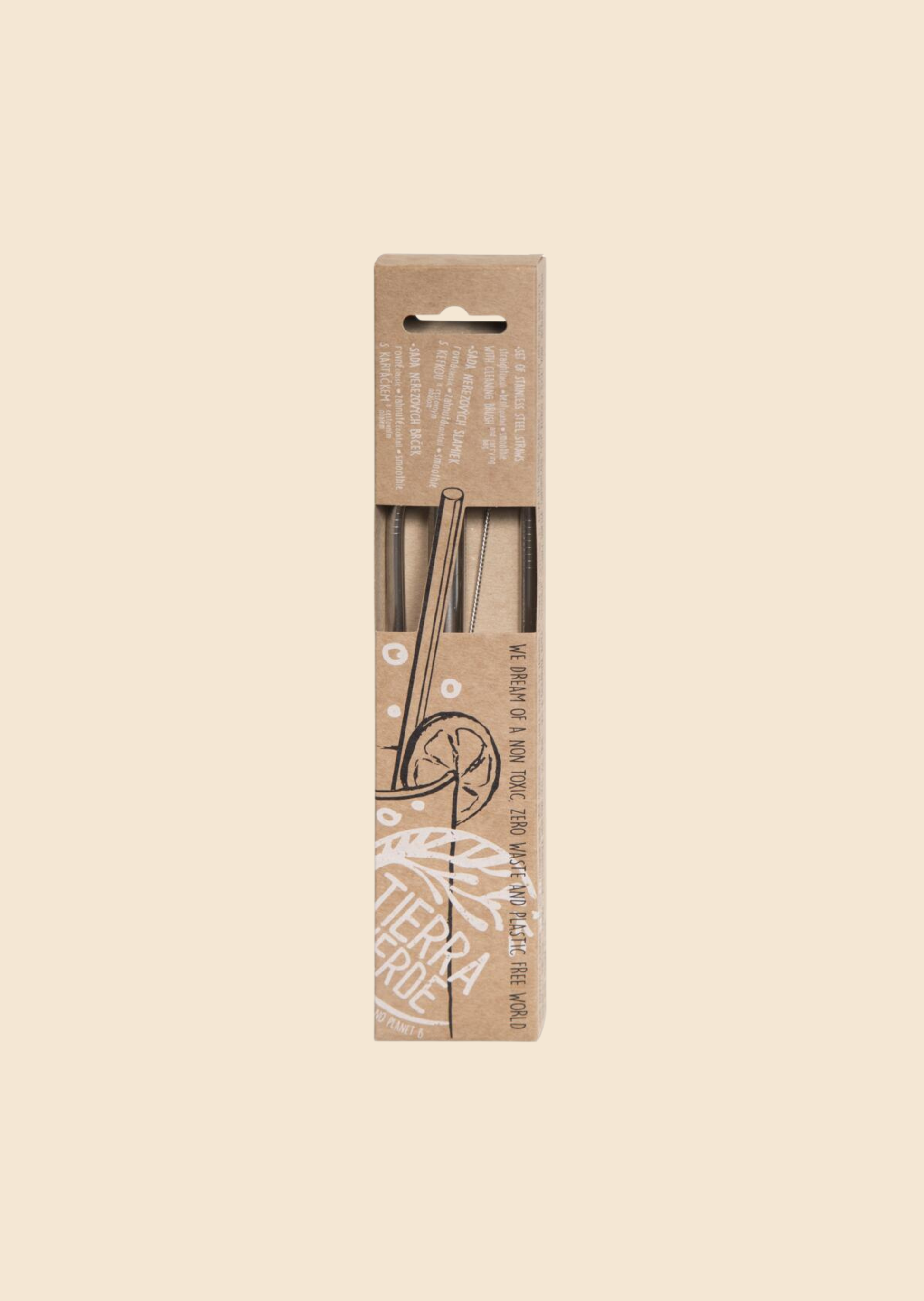 Materiál: brčka - potravinářská nerezová ocel 304, obal – 100 % biobavlna, kartáček - nylonové štětinky.