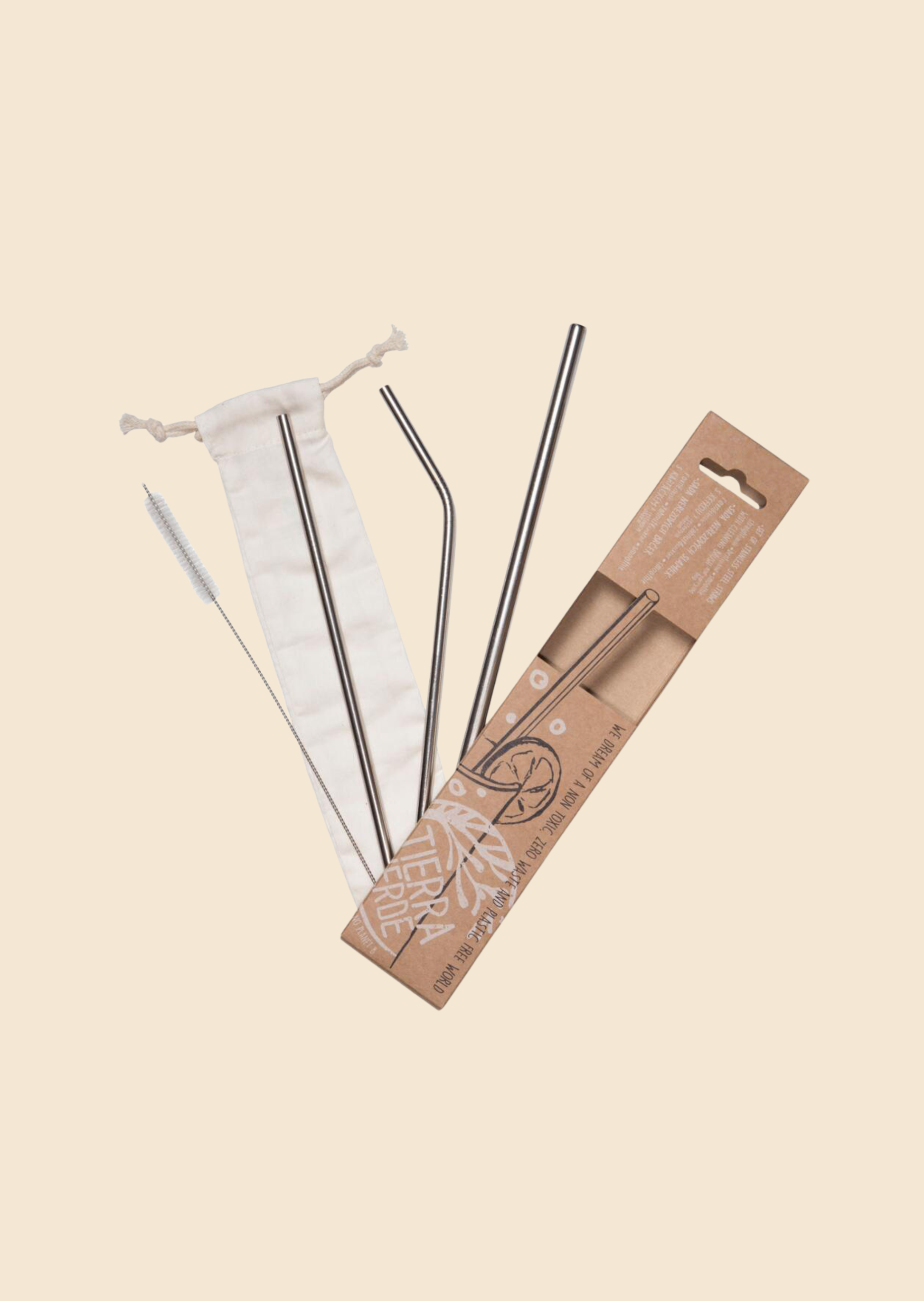 1x brčko rovné, 1x zahnuté, 1x široké na smoothie, 1x kartáček na čištění brček, 1x cestovní obal na brčka z biobavlny.