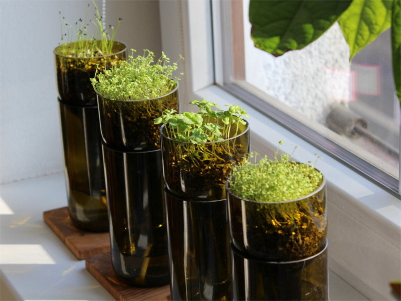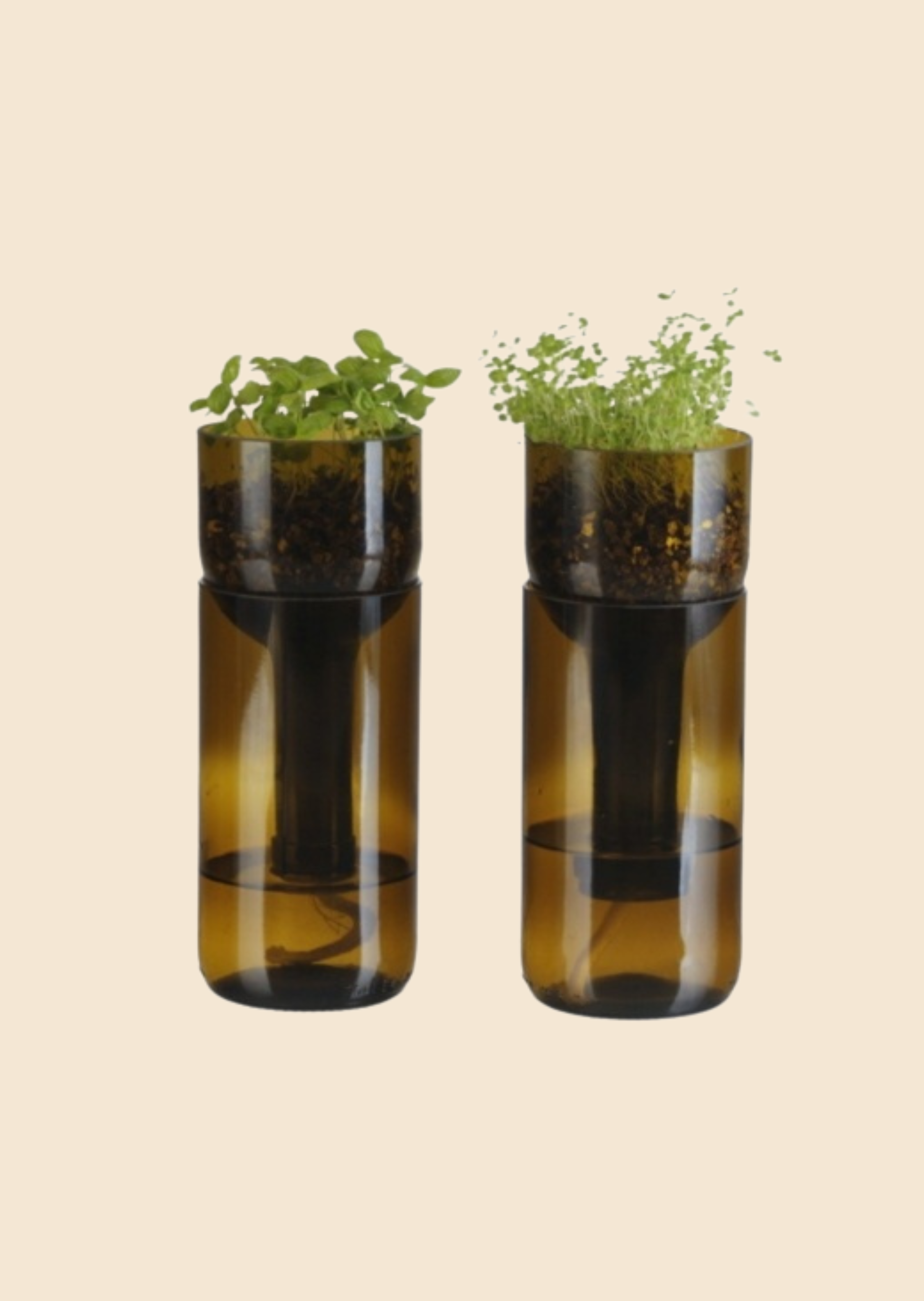 V květináči vyrobeného recyklací vinných lahví můžete pěstovat microgreens (např. řeřichu, hořčici, ředkvičky aj.), drobné řízky nebo malé rostliny, které buď sníte nebo pak přesadíte do většího květináče.