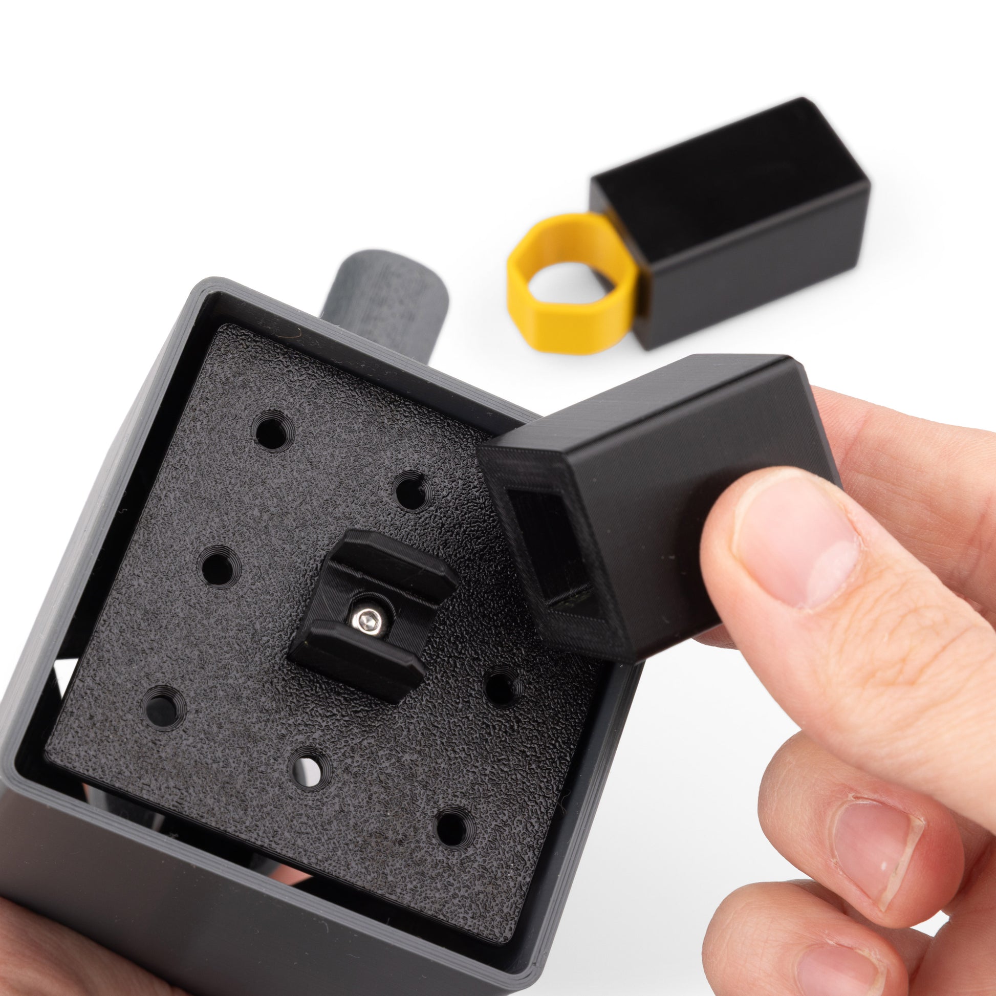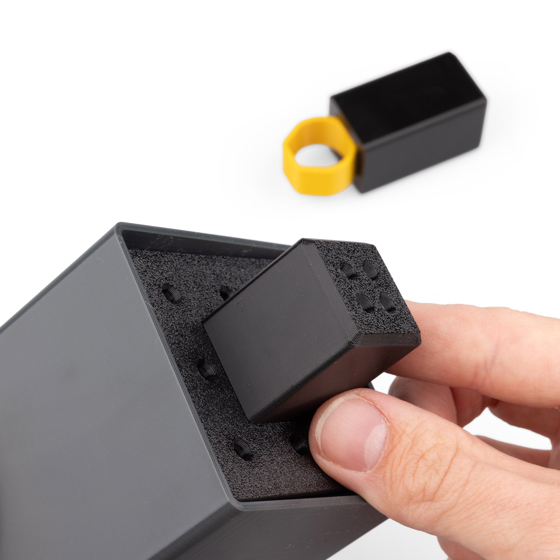 Velikost jamky pro menší kostku: 2,6 × 2,6 × 3,4 cm