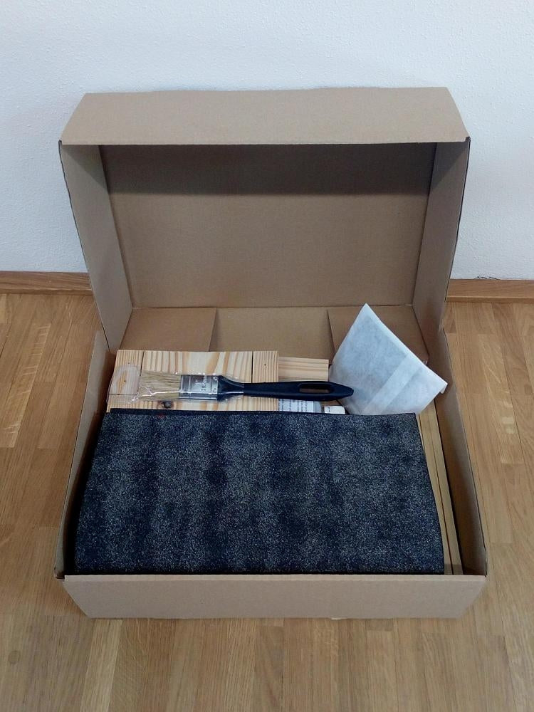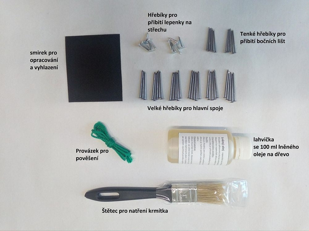 Stavebnice budky obsahuje všechny potřebné díly pro sestavení - jednotlivé díly krmítka, smirek na vybroušení jednotlivých dílů, 3 druhy hřebíků, lepenka na střechu, štětec, 100 ml oleje na dřevo, šňůrka na pověšení nebo přivázání a podrobný návod, jak krmítko správně sestavit a natřít, jak a kam jej pověsit a co do krmítka následně sypat.